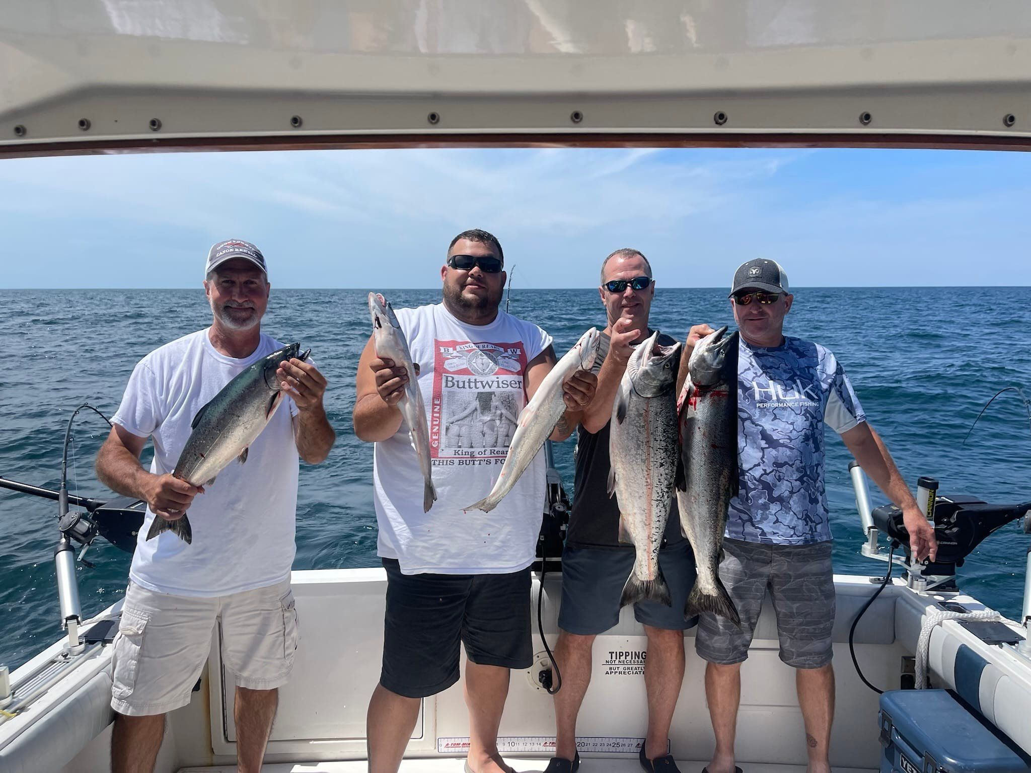 Lake Ontario fishing is all about covering water and reading the electronics. We run downriggers with spoons and flasher setups at different depths, typically working anywhere from 40 to 200 feet down depending on where the thermocline sets up and where we're marking bait. The key is staying mobile and adjusting to what the fish are telling us each day. Some mornings they want bright chrome spoons in the top 60 feet, other days we're pulling meat rigs deep along the thermal breaks. We've got planer boards to spread our lines wide and keep them away from the boat noise, plus all the rod holders and fighting belts your group will need when something big decides to eat. The afternoon trip gives everyone time to learn the gear before we really get serious the next morning.